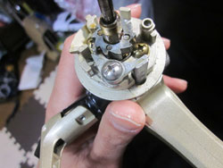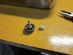 で、空回りのONOFFスイッチのシャフトが残ったままなんですが、スイッチのPOMつまみが抜けません。今のリールはビス止めで外れるようになっているんですが、コイツはおそらく矢印タイプのカシメだと思うんで、これ外そうと思ったらナンギすると思うし、付いたままでも掃除できるので、外さないことにします。