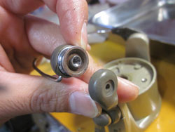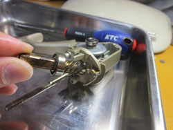 続いてピニオンギアにはグリス、ベアリングにはオイルを滴下し、スプールシャフトにセット。