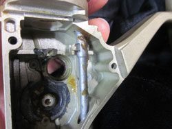 んで、早速組み立てですが、最初にベアリングを入れようとしてビックリ。ハンドルシャフトのベアリングのハメシロ調整にワッシャが一枚入っていました。知らぬうちになくしたら大変なことになっていました(汗)