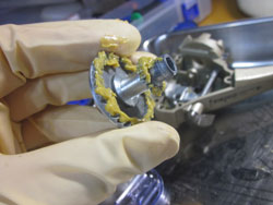 スプール内部は投げ釣りで付いたと思われる、砂浜の砂がかんでいました。このスプール内部もEリング外せばもっとバラせそうですが、その必要はなく、付いたままで掃除できるのでそのままにしておきます。