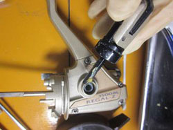 最後にウォームギアの代わりになるギアを抜きます。現在のリールではここにウォームギアが配置され、スプールを上下させていますが、大昔のリールはこのパーツがウォームギアの代わりをするようです。