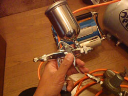 おそらく、エアブラシ程度じゃ、4mmホースでも空気は間に合うんでしょうが、スプレーガンになると、4mmホースじゃ細すぎて、空気供給に支障が出るんでしょうね。