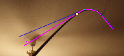 で、曲げながら弓頂点を追っていくと、やがて弓頂点が出ないポイントがやってきます。つまり、テーパーデザインというヤツです。ブランクがファーストテーパーなら前側に、スローテーパーなら後ろ側に来ます。テーパーの頂点が出てしまうと、弓頂点を探そうにも、弓頂点がないので、ピッチ間推理理論により、ガイドの位置出しをします。この写真だと、弓頂点が赤丸で、それよりもバット側が弓頂点の出ない区間です。ここからは、ピッチ間推理理論でガイド位置を探していきます。