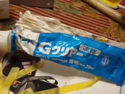 で、ボンドGクリアーというボンドを使ってガイドを置きます。伸び縮みするボンドです。乾くのも遅いし、乾いてからもグニョグニョしているガムみたいなので、ガイドをずらしたり出来ます。
