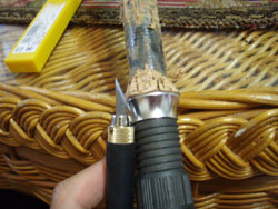 バットキャップ部分は強化コルクなのでなかなか切れませんので、この時点でカッターの歯を入れ替えましょう。ちょっと削っただけですが、すでにカッターの歯はボロボロです。