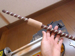 たまにメーカーロッドで見かける両テーパーの加工をやってみました。いつもどおり、旋盤でやるんですが、マタギのシェイプドグリップを見つつ、先端からテーパーをかけて、真ん中でくびれるように・・・・・