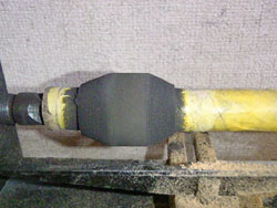 で、こんなんなったら、逆側のテーパーをかけるんですが、EVAがズレる。どうも芯棒のテーパーが「左>右」になるように削り込んでいる関係で、左へ流す加工はうまく行くんだけど、右に流す加工は力をハメると、材料がズレるので問題ちや。