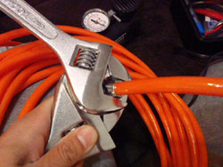 で、タケノコをコンプレッサの先に差しこみ、ホースの固定バンドで固定。ちなみに、アルミバンドのねじ式はサイズが大きすぎて合いません。園芸用の、9mm→11mmサイズのヤツを買いました。200円。