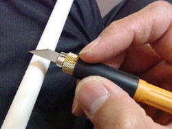 コレです!アートナイフの曲線刃です。普段は、直線刃を使うことが多いんですけど、これだと、結構ブランクに傷がいくんですよね〜。