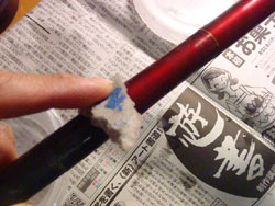 あと、グリップビルディングがヘタすぎ!さすが、ビルディング1年生の時に作ったヤツやけん、エポキシははみ出しまくっとるわ、散々使い倒して、コルクは欠けだらけ。