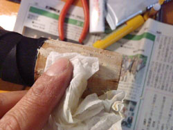 いつものようにロックリムーバーを塗って1時間後、カッターの裏刃でガリガリと塗装を落として、