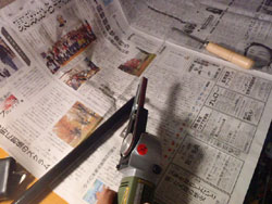 そんなわけで、前回、ニッカリ青江グリップ改造で紹介したとおり、マタギリーマー+ドリル+空研ぎでペーパーを当てながら削ります。
