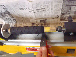 集積コルクは、まず内径を20mmまで広げて旋盤にセットし、