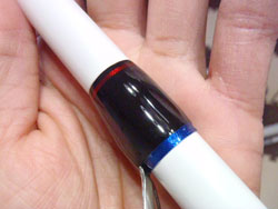 驚くなかれ、ブランク断面はコレですわ!極太!さすが、大昔のヘビーロッドwチクワみたいなブランクやっ!重い上に良く曲がるので、なかなか折れないと思いますwしかし、厚みに偏りがありますね。左が厚い。これがスプラインか!?