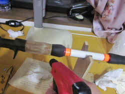 んで、約半日たつと、結構硬化してきたんですが、ウッドエポキシ、表面に粉吹いたのが残るんで、半硬化のうちに除去するほうが肌触りがいいです。そのため、この時点で