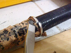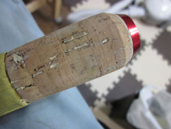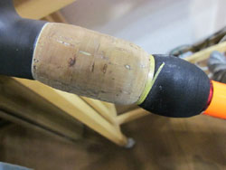 一応、こんな感じに修復しました。ワンポイントがグリップエンド部で、たいてい、コルクの内径拡張のときにハジっこが削れ過ぎてしまうんで、隙間があります。中央付近のスキマならわからないんですが、先端まできているスキマはエンドを握った時にフニョフニョとなる可能性があるんで、ここは念入りに埋めておいたほうがいいです。