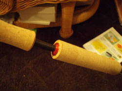 メバルブランクは細いから、幸いエンドキャップとの間にずいぶん隙間があります。そこに、糸オモリを巻いていって、それをバランサーにします。内部バランサーシステムと名づけました。これをやっている市販ロッドはないでしょうw