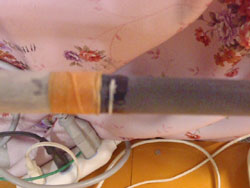 パイプの中腹あたりが、バランスよく加熱できそうな感じがするので、狙ってしまいがちですが、それは間違い。パイプとブランク間に隙間がほとんどないので、先端の接着剤は加熱できず外れないわ、おまけにブランクに直接当たって、ブランクを溶かすリスクが上がるわ、良いことないです。