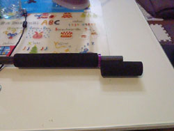 そして昔作った、グリップ溶着装置(シャドウライズグリップ製作参考)で両端からテンションをかけます。EVAは変形したまま固定されてくれるので、こういう風に両端からテンションをかけながらエポキシ硬化を待つと、若干ナナメだった切り口が真っ直ぐなって溶着してくれて見栄えが良くなります。