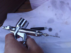 で、続いてクリア。クリアは0.3mmじゃ小さすぎるので、0.4で吹きます。クリアはちょっと塗って、しばらく待って、またチョット塗って、という具合に繰り返して段々とツヤを出していきます。というのも、クリアはベースコートに比べて渇きが遅いので、タレやすく、また少々塗り重ねの時間をとっても、ユズがナミツヤになる余裕があるため、1回の吹き付けでより乾きにくいほうが都合がよく、1ツブ1ツブが大きいほうが失敗なくいきやすいのです。でもって、リールシートはいびつな形なので平吹きよりは丸吹きの方が都合が良いので、アリーズSGA6104をチョイス。久々のアリーズ出動です。