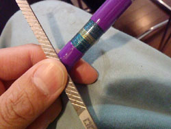で、完全硬化後はこんな感じ。はみ出たところが白くなっていて、見栄えはいいとはいえません。やはり旋盤で完璧にハシを平坦にしたほうが出来栄えがいいなぁ。嗚呼旋盤欲しい。