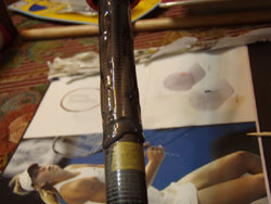十中八九、エポが手に付きます。このままグリップを組むと、かならずエポがコルクに付くので、