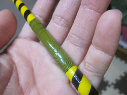 で、下巻きはジャストエースの黒、黄色のCスレッドwpトリムでまいていくことにしました。このトリム、結構曲者で、途中でヨレてしまい、間隔がおかしくなることが多く、また、トリムだけにそれが目立つ(汗)難しいですな。