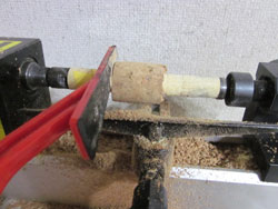 ここから旋盤にかけます。とはいえ、このホムセンコルク、でかすぎて、支え台にひっかかって回らないので台を少しずらします。