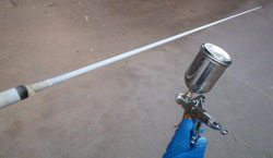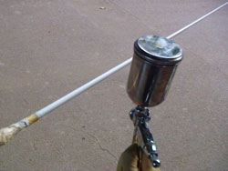 で、全ガイド下巻きが完成したので、コーティングに入りますが、今回ちょっとやり方をかえました。いつも、ソフト:ハード=2:1のやりこい配合のコーティングで行っていたんですが、考えてみると、下巻きってガイドとブランクのきしみ防止のためにやるものなので、硬いほうがいいんじゃないかと思い、ハードオンリーで行ってみることにしました。下巻きはガイドがないので、クラックが入る心配もなく、むしろ、こっちのほうがいいと思います。