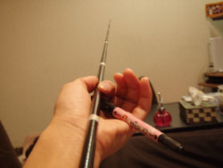 ただし、市販のロッドを見てみると、だいたい、スプラインはあっていません。45度〜90度くらいズレているのがほとんどです。これは、歪みが小さいので、トップガイドをつける時に、スプラインを探す手間をヘズっているからではないかと思われます。また、スプラインを確かめる時はバットからティップを凝視しながらやるもんですが、これをやると、バット部分にスプラインのマーキングは出来るけども、それをティップにそのままずらしていくことが困難なため、厳密なスプラインだしというのは実際はなかなか正確に行かないというのが本音ではないでしょうか。