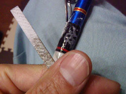 で、ガイドを付けようかなと思ったらトラブル。キレイに処理したと思ったんですけど、中央のメタリックスレッドに凸がありました。