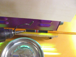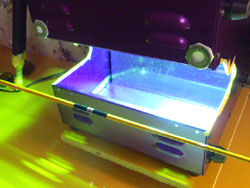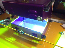 UVを照射させます。この時、イキナリランプの真下にぶちこんだら、一気に硬化して凄まじい反応熱が出て、気泡は出るわ、タレるわ、ろくなことがないんで、フタをあけた状態で、若干遠くからUVを当てます。およそ10秒くらい。