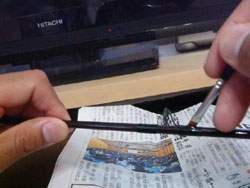 あと、フデですが、エポキシでやる場合は、時間が経つと粘性が上がってくるエポキシの物性上、広範囲のスレッドは、なるべく短時間で作業を終わらせるほうが効率がいいので、広いフデを使います。そのため、広いフデをたくさん使うんですが、UVコートの場合、時間が経つと粘性が上がるということがないんで、早い話、チューブで塗った後、アルコールランプでなじませて、タレかけた接着剤を広げて整えるだけなんで、広いフデがいりません。また、照射しないと固まらないのでフデ先が固着することがなく、
