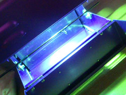 で、スイッチを入れたらUV照射が始まるんですが、なんせ光が強いので、ハードナーの真横でやって、漏れた光で硬化しないかが最大の焦点。