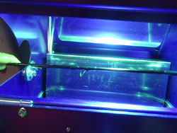 そして回っているブランクにゴマ付きの台車に乗ったUVハードナーをイン。