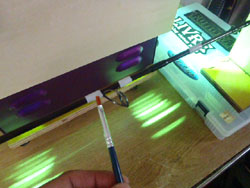まずは、蛍光灯でブランクを明るく照らした後、UVコートをボトルからたらし、フデでならしていきます。