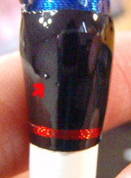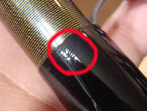 ただし、できばえについてはダメで、ティップ付近はブレが少ない分、コーティングはきれいにいきますが、バット付近の太い部分のコーティングが回転のセンターずれによる樹脂のでこぼこがあって、見た目が悪いです。あと、スレッドの端のエッジをキレイになぞることが困難。そのため、フデが広がる瞬間があって、その時にエッジがはみ出ます。そのため、筆先が広がりにくい小さいフデのほうがコーティングがうまくいきます。