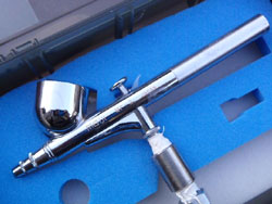 で、これに慣れてきたら、プッシュプル式で細かい作業に移行しようと思っていて、リールに絵を書く予定なもんだから、なるべく細かい作業が出来るエアブラシが必要になるんで、プッシュプル式は0.2mmでキマリやき!
