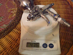 重い。PCJUMBO206は130ml?カップで436g。今、普通のスプレーガンって、だいたいアルミなんですよね。ですが、オリンポスは、真鍮です。だきん重い。しかし、エアブラシって、大体真鍮ですよね。プロに言わせれば、真鍮の削り出しが一番精度が高く、キレイなミストが出るそうです。値段も、凄まじいです(汗)