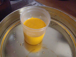で、ペンキのテスト。オレンジのペンキ50ml、硬化剤6ml、ハジキ止め、標準シンナー追加で100ml(45ml配合)。吹きつけはOK。トラブルなくいけると思います。