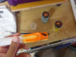 で、オレンジの調合。容量比で、キュートエロー5、シンクレッド1で、シンクレッドが固まり気味だったので、若干パナロックシンナーを足して混ぜています。