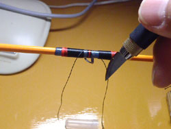 下巻きの位置を細いマスキングテープでマーキングします。スレッドをこのマスキング部分に仕掛けます。