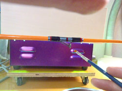それから、気泡がカナリ残っている部分もあります。これ、もっちりつけた時に出てくるんですが、UVコートの場合、粘性が変わらないんで、コーティングのラインを「まっすぐ」にしようと思ったら、たれるくらい持って、アルコールランプで加熱して、たれかけたナミダを筆先で左右に広げてまっすぐにするしかありません。薄塗りを重ねていくと、フデの跡目が表面をデコボコにしてしまうので、まっすぐのコーティングが出来ません。そんなわけで、長距離コーティングではモッチリと塗るしかなく、その結果、こーゆー気泡がかんでしまいます。これはエポキシでもそうですが、エポキシみたいに粘性が上がってくれたらやりやすいんですが、UVコートは粘性が上がらないので、そこが良い点でもあり、逆にデメリットにもなります。