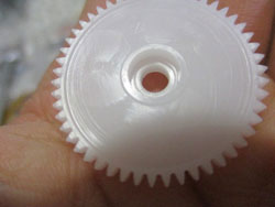 このコグ、不思議なことに、下側の大径ギア側の穴は、成形時に付けていると思われ、成形時の金型の跡がついております。