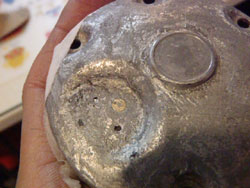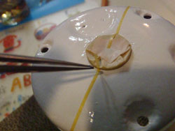 で、よーに見ると、エポキシでも、シールの底が変形しております。UVでもエポキシでも同じように変形しているということは、樹脂ではなく、シールの問題???今回はテプラの純正シールでポッティングを行いましたが、前回、ホンダマークを作ったときは、そんなに変形してなくて、うまいこと貼れました。その際使ったシールはカッティングシートです。