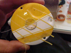 で、続いて黄色を塗ります。ストロボカラーを置く場所をマスキング。下は白にするのでマスキング。IARやら、メカニカルキャップやらがむちゃんこ邪魔!ノペッとしたリールの方がぬりやすいねぇ。
