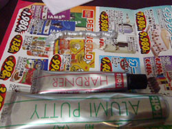 そして、エポキシシンナー。何系のシンナーなんだろ?と思って匂いをかいだらアセトンそのまんま。アセトンつこてんの?でもトルエンよりはダイブ臭くないのでうれしい限りです。この匂いならば、部屋の中で作業・・・・はマヅイカな???