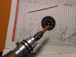 で、続いて固定ですが、コグホイールはガタが出ると飛距離が落ちてしまうので、Eリング固定は絶対キャンセル。あとはベストタックルのようにガタの出ない丸状のリングを入れるか、千鳥屋みたいに、接着剤でシャフトの肉厚をかさましして入れるかですが、ベストタックルの場合、ベアリングの内輪が供回りしてしまうので、固定方法としては千鳥屋のほうが優れていると思います。さらにリングの加工の必要性もないことから、コグの固定は千鳥屋方式で行きます。