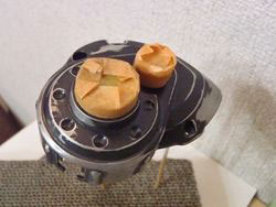 まずは、レベルワインドのカバー。どうせ乾燥後に引けが出て、デカールが浮くので、かなり厚めに吹いています。ちなみに、タレ防止と、ワングリップからの落下防止のために、台座に1個ずつ固定して吹いています。