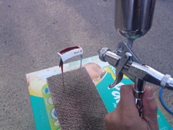 ガンは、PC206でも使おうかと思ったんですけど、今回、レベルワインドカバーの内枠がちっこくて、なおかつ、内側からえぐりこむようにミストを当てなきゃいけないので、あえて、0.3mmのPC203を使うことにしました。